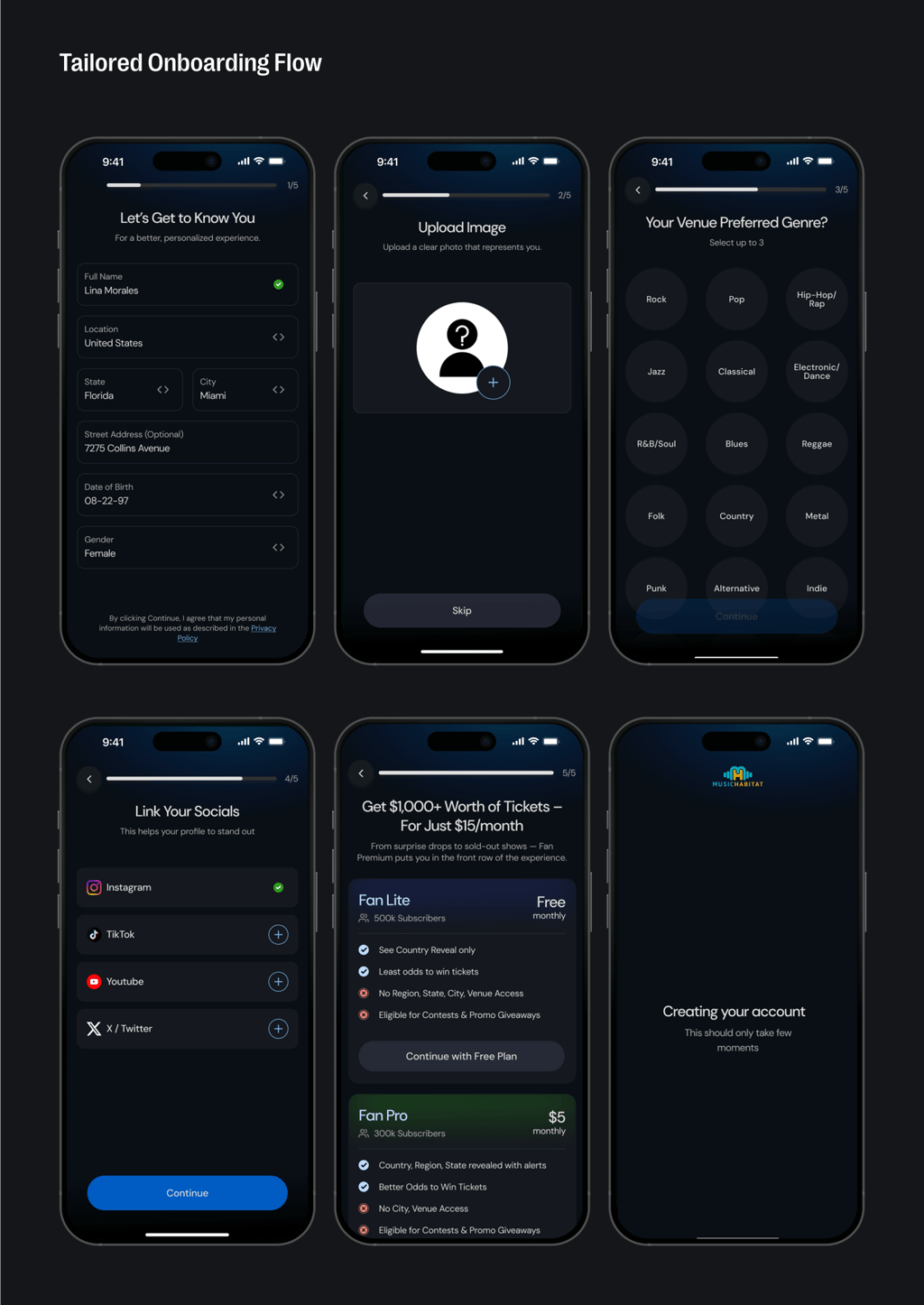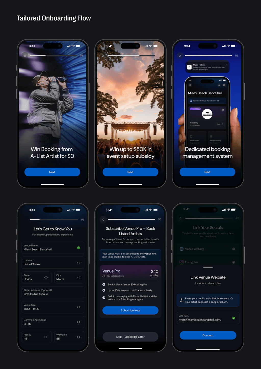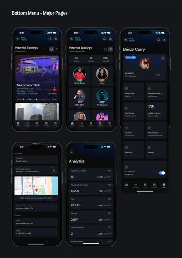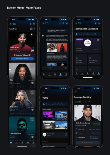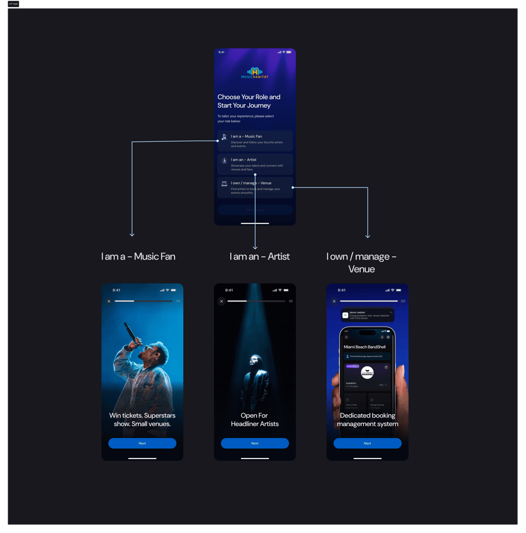 🟢4 user type Fan, Headliner , Venue , Emerging Artists UI experience
