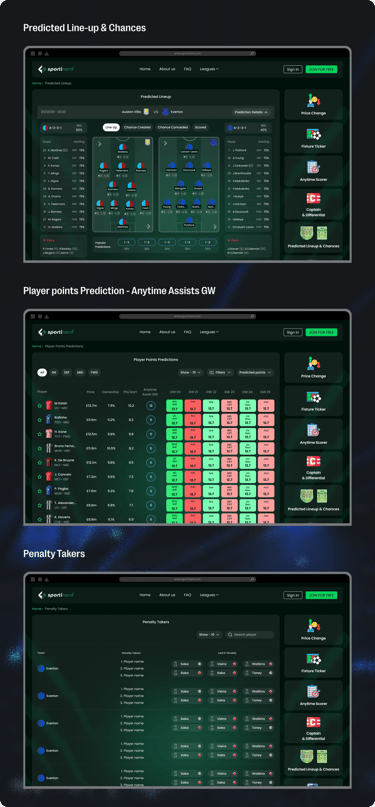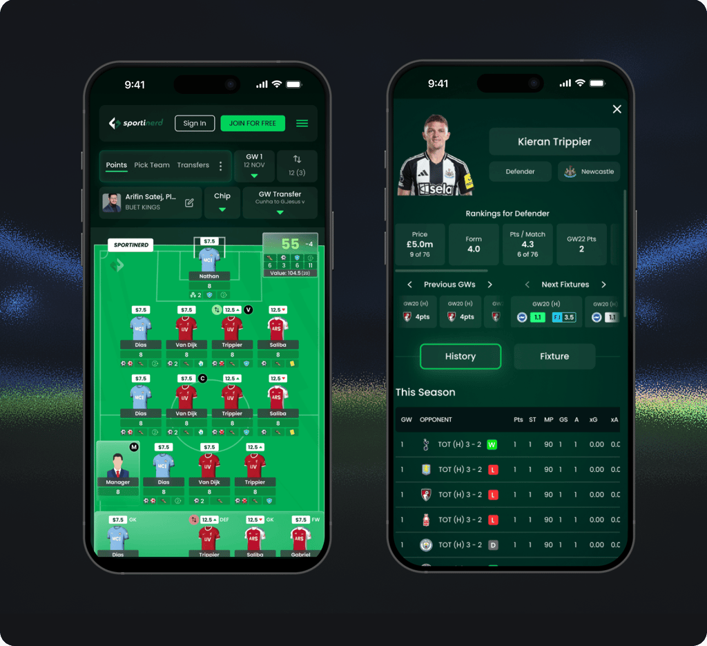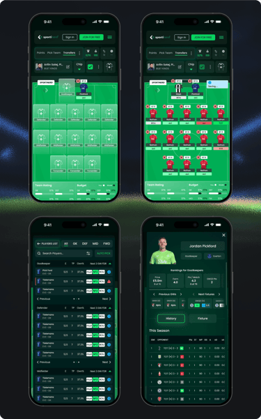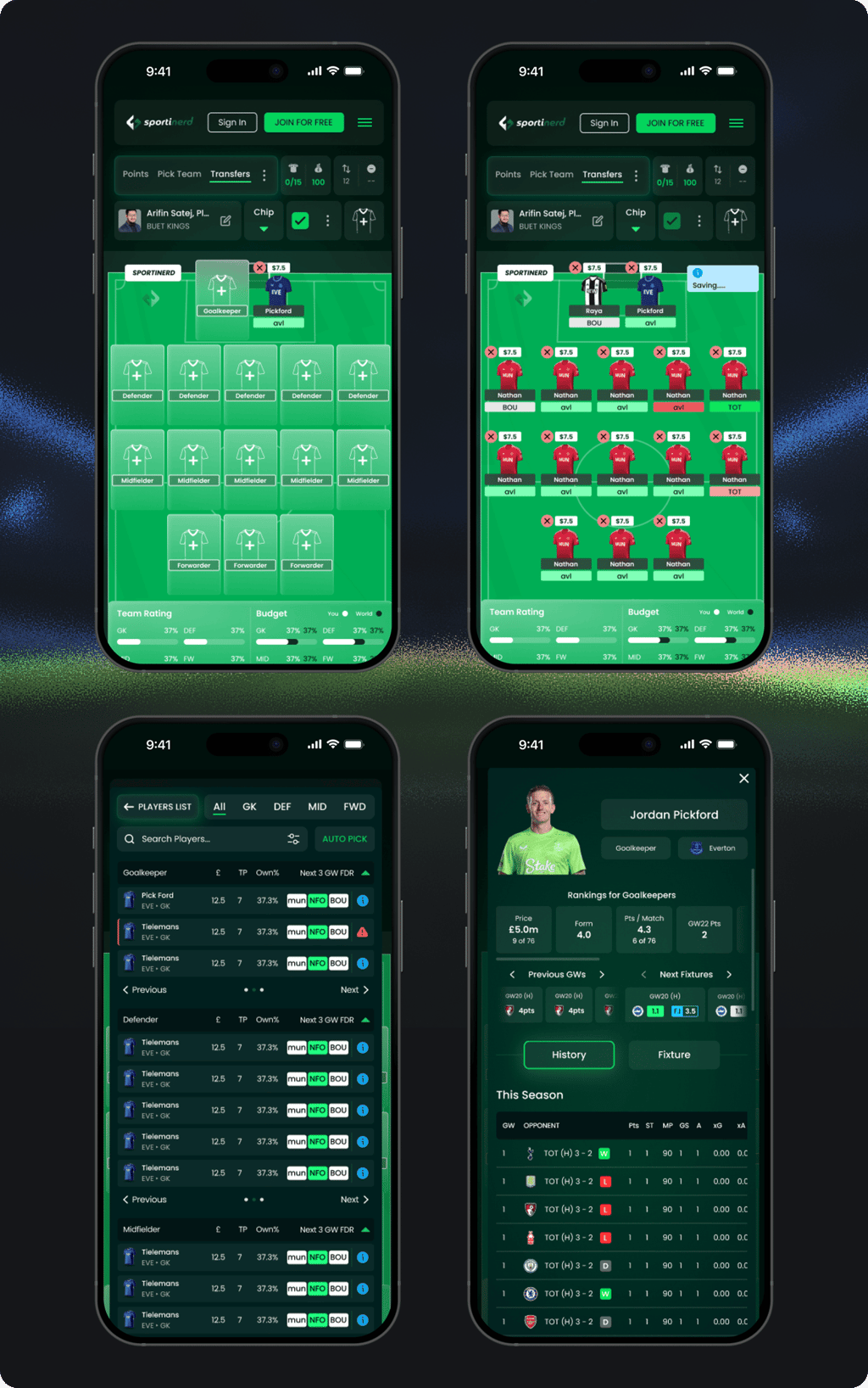 Sportinerd is a fantasy football platform that combines Fantasy Football, Football Analytics, and Live Scores—all in one place. It’s designed with a clean, modern UI to deliver a smooth and engaging experience.