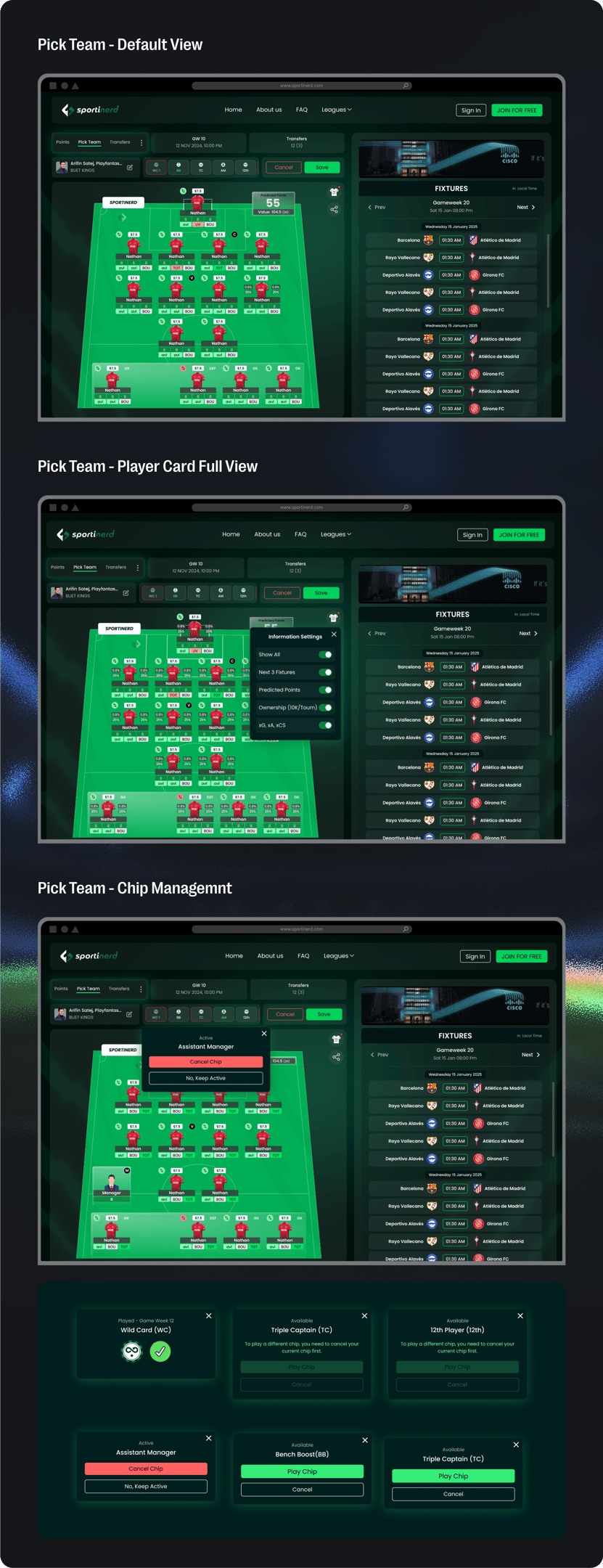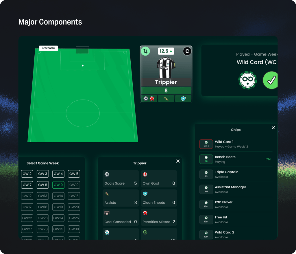 This feature lets users build their own fantasy team, join gameweeks, play chips for extra perks, and earn points based on real match performances.