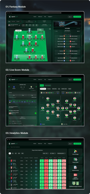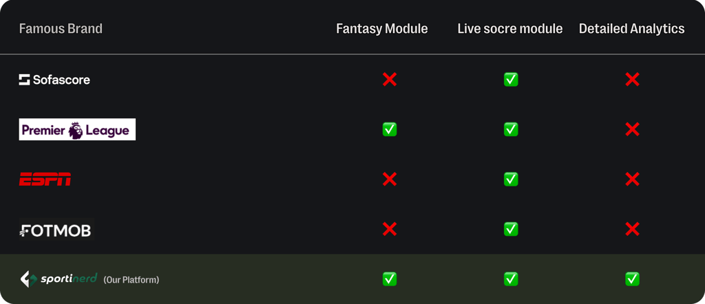 Most fantasy football platforms don’t offer Fantasy Football, Analytics, and Live Scores all in one place. This creates a disjointed experience for users. Sportinerd solves this by bringing all three modules together in a single platform.